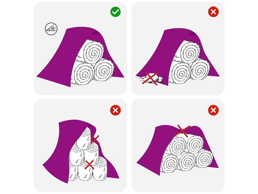 - Prodyšnost a odolnost proti plísním: plachta umožňuje únik vlhkosti a zároveň zajišťuje přísun čerstvého vzduchu k balíkům.