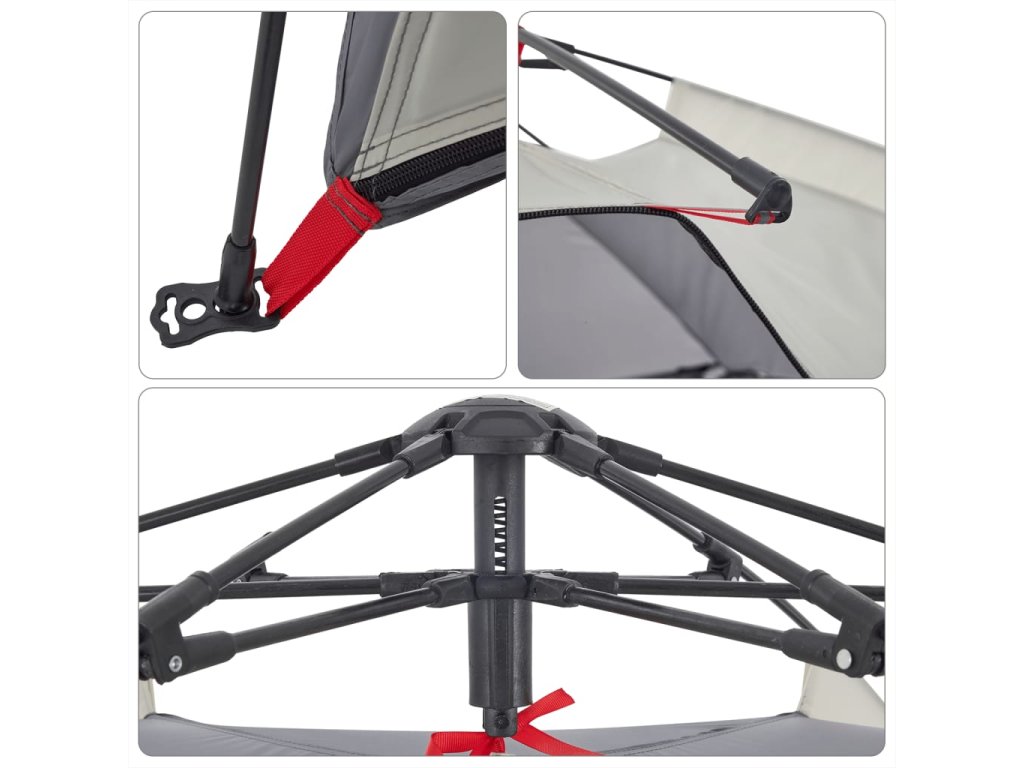 - Rychloupínací systém: Postavte stan snadno a bez námahy pomocí rychloupínacího systému! Stan položte na zem, roztáhněte předem sestavené tyče, dokud nezapadnou na své místo, a vše je hotovo!