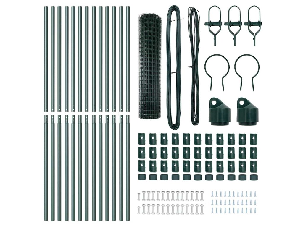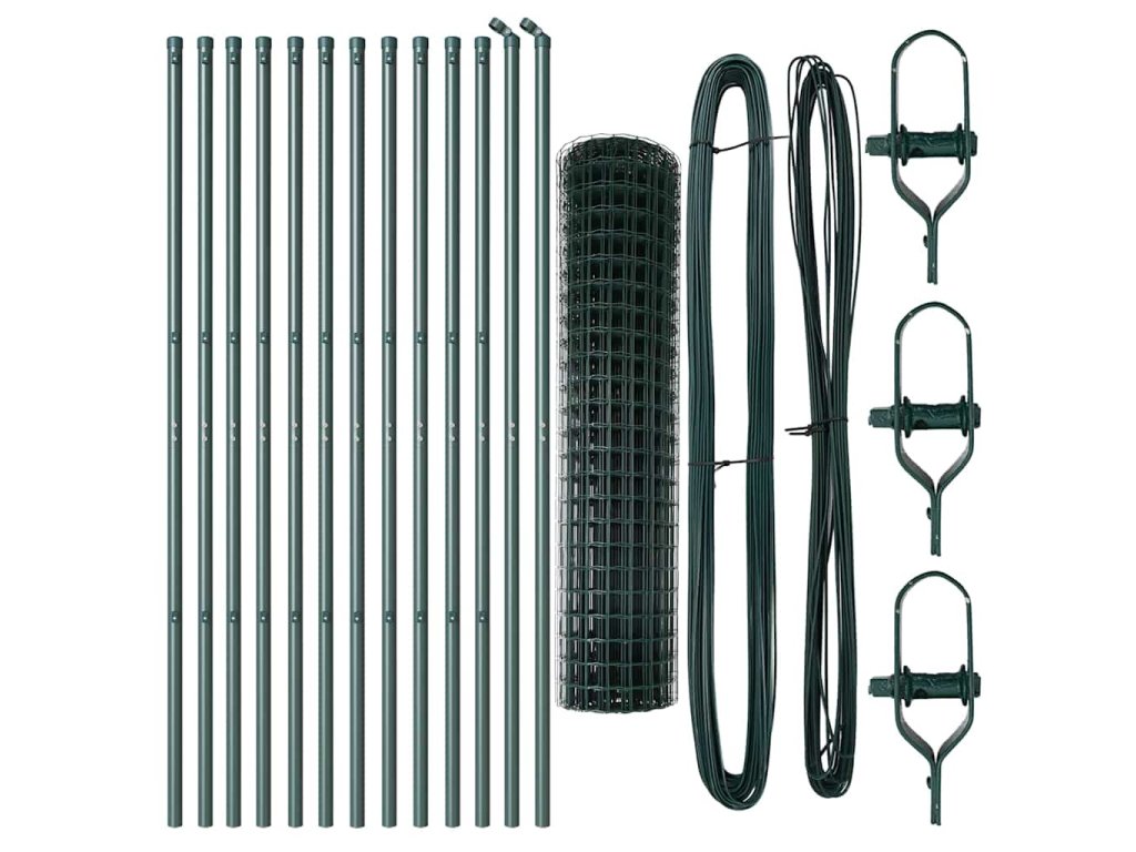 - 1 x Euro plot, 11 x sloupek, 2 x úhlový sloupek, 11 x hrot, 2 x úhlový hrot, 11 x plastová krytka, 33 x plastový podpěrný drát, 2 x krytka úhlového sloupku, 2 x hardware úhlového sloupku, 3 x napínač, 1 x 25 m bindovací drát, 1 x 80 m napínací drát