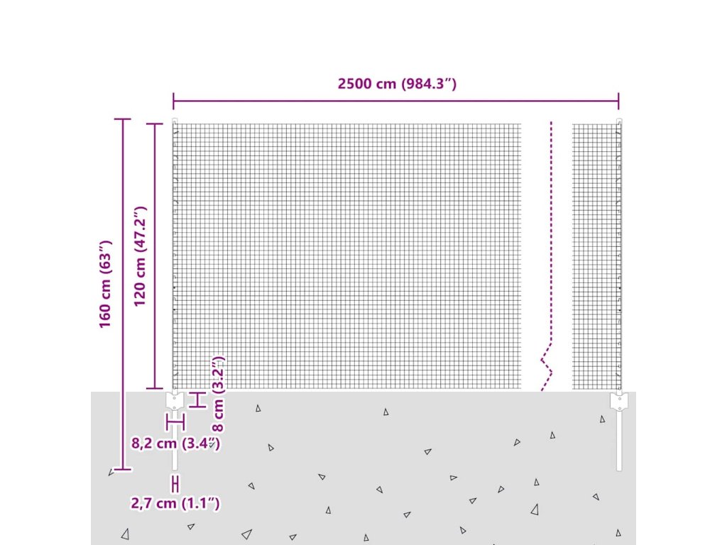 - Celkové rozměry: 2500 x 2.7 x 120 cm (D x Š x V)