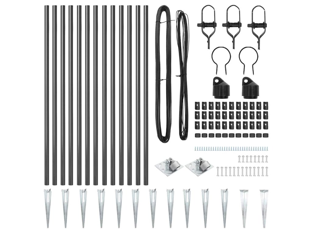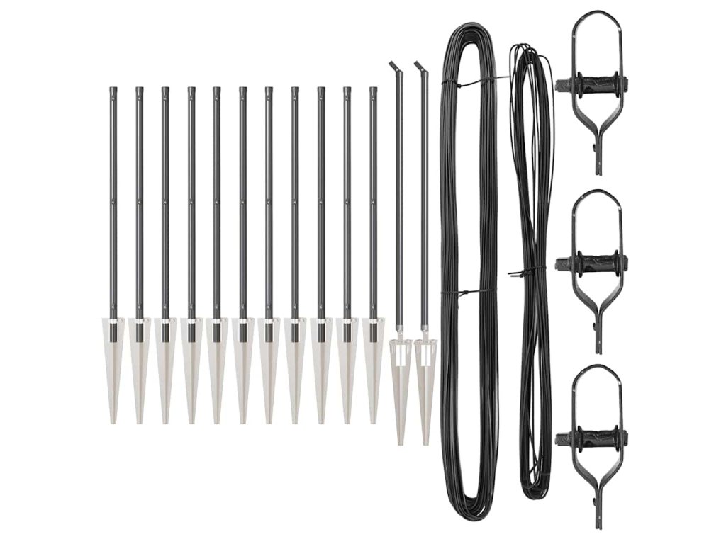 - Obsah balení: 11 x sloupek, 2 x úhlový sloupek, 11 x kolík, 2 x úhlový kolík, 11 x plastová krytka, 33 x plastová napínací drátová podpěra, 2 x krytka úhlového sloupku, 2 x hardware úhlového sloupku, 3 x napínač, 1 x 25m vazební drát, 1 x 80m napínací drát<\li>