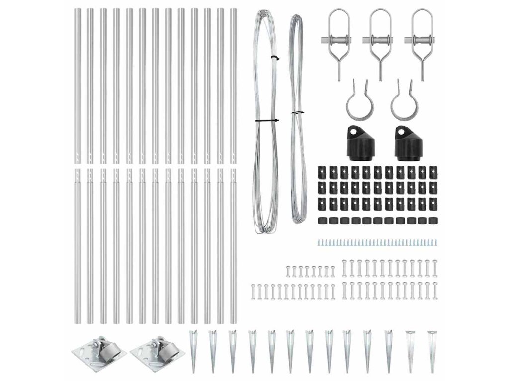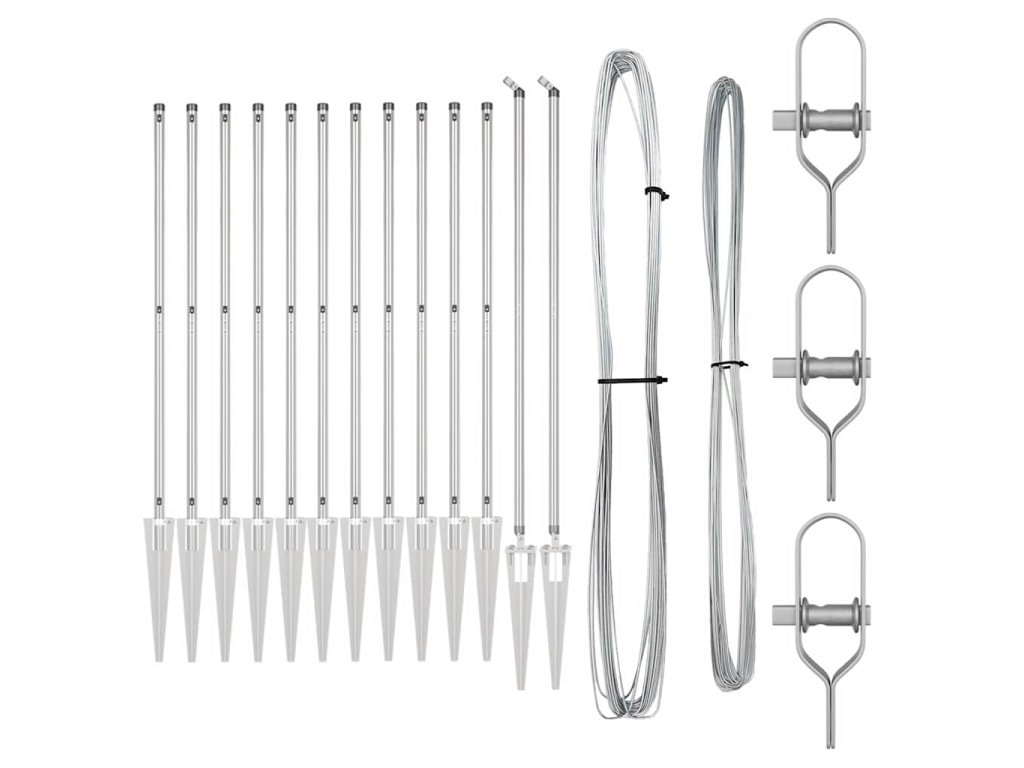 - Obsah balení: 11 x Post, 2 x Úhlový sloupek, 11 x Spike, 2 x Úhlová spike, 11 x Plastová zátka, 33 x Plastový napínací drátový podpěra, 2 x Úhlová zátka, 2 x Úhlové sloupkové hardwarové kování, 3 x Napínák, 1 x 25m Vázací drát, 1 x 80m Napínací drát<\li>