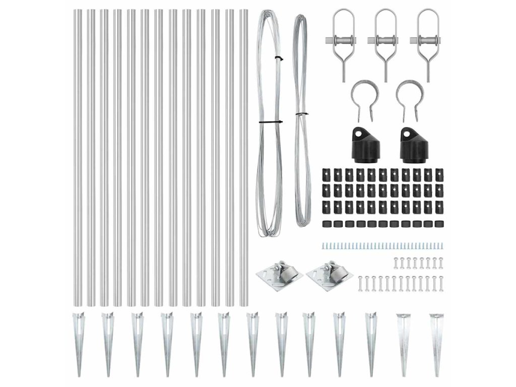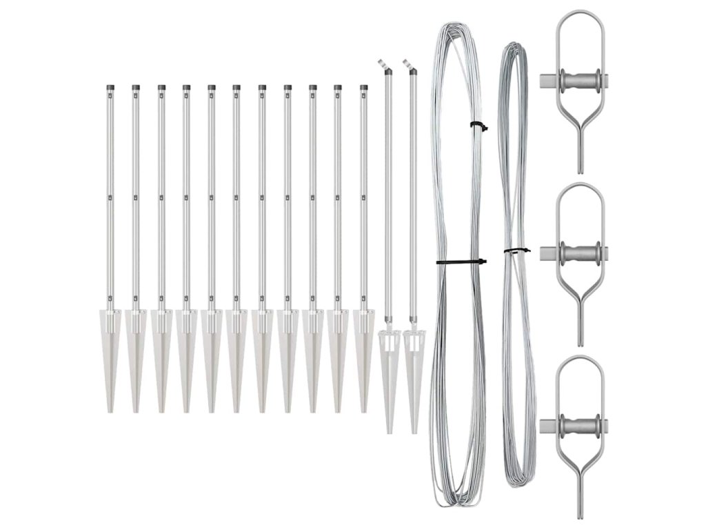 - Obsah balení: 11 x sloupek, 2 x úhlový sloupek, 11 x hrot, 2 x úhlový hrot, 11 x plastová krytka, 33 x plastové napínací dráty, 2 x krytka úhlového sloupku, 2 x hardware úhlového sloupku, 3 x napínač, 1 x 25m vázací drát, 1 x 80m napínací drát<\li>