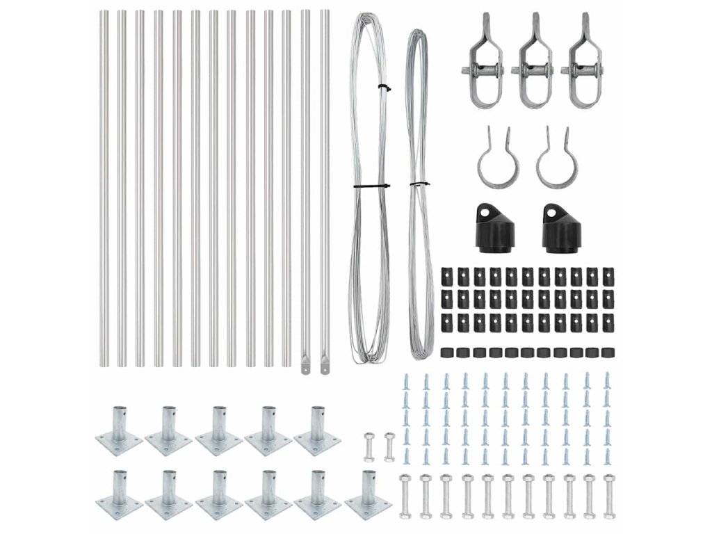 - Obsah balení: 11 x Sloupek, 2 x Úhlový sloupek, 11 x Podložka, 11 x Plastová víčko, 33 x Plastový napínací drát, 2 x Úhlová sloupková víčko, 2 x Úhlová sloupková hardware, 3 x Napínák, 1 x 25 m vázací drát, 1 x 80 m napínací drát<\li>