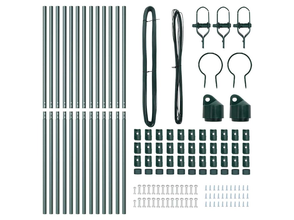 - Obsah balení: 11 x sloupek, 2 x úhlový sloupek, 11 x kolík, 2 x úhlový kolík, 11 x plastová krytka, 33 x plastová napínací drátová podpěra, 2 x krytka úhlového sloupku, 2 x hardware úhlového sloupku, 3 x napínač, 1 x 25m vazební drát, 1 x 80m napínací drát<\li>