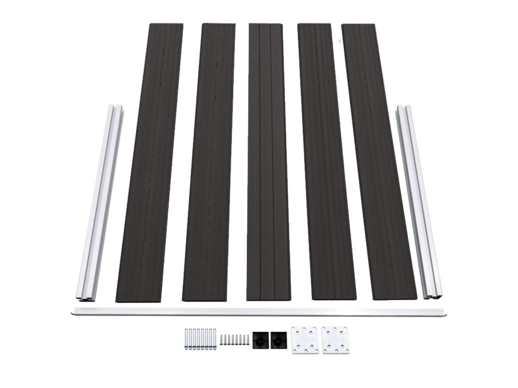 - Materiál: WPC (dřevoplast), hliník, ocel