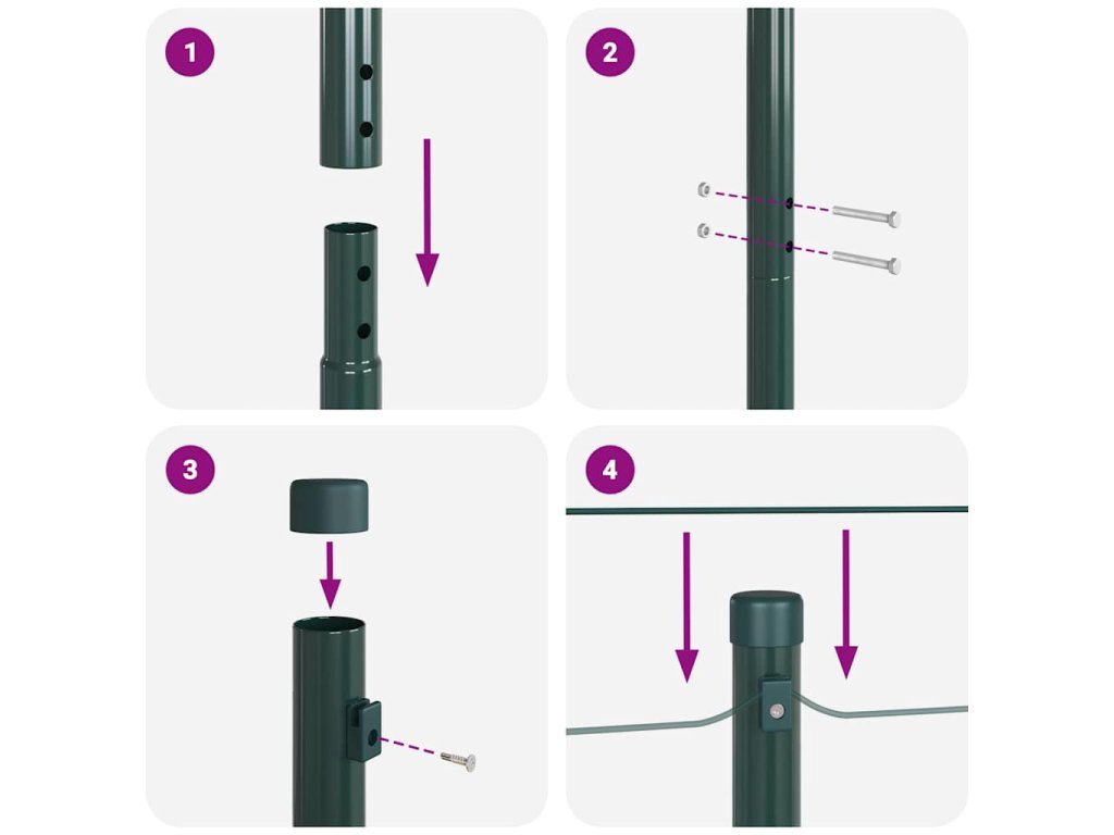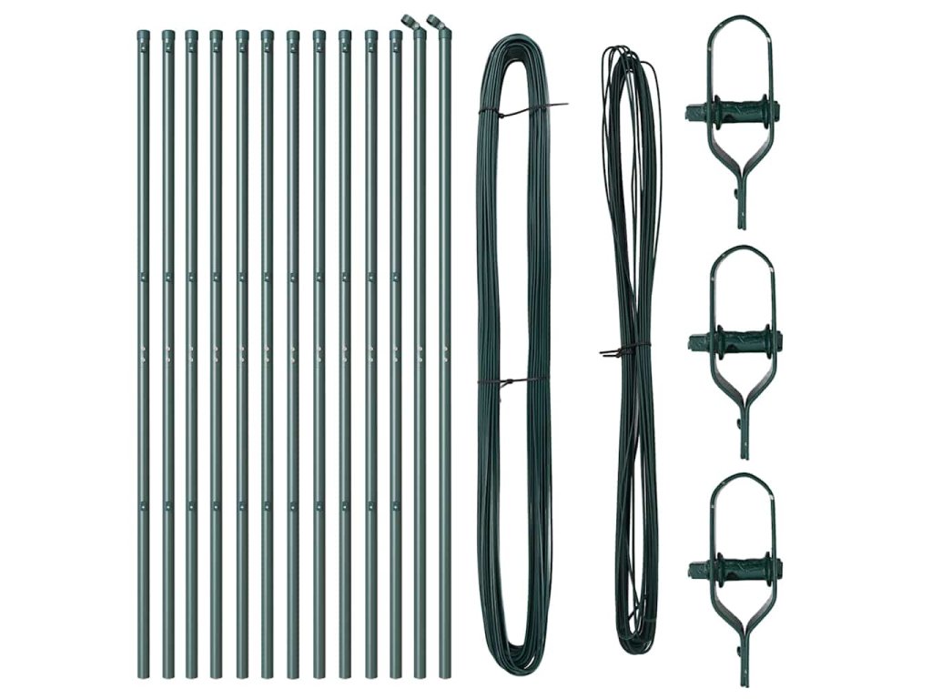 - Obsah balení: 11 x sloupek, 2 x úhlový sloupek, 11 x kolík, 2 x úhlový kolík, 11 x plastová krytka, 33 x plastová napínací drátová podpěra, 2 x krytka úhlového sloupku, 2 x hardware úhlového sloupku, 3 x napínač, 1 x 25m vazební drát, 1 x 80m napínací drát<\li>