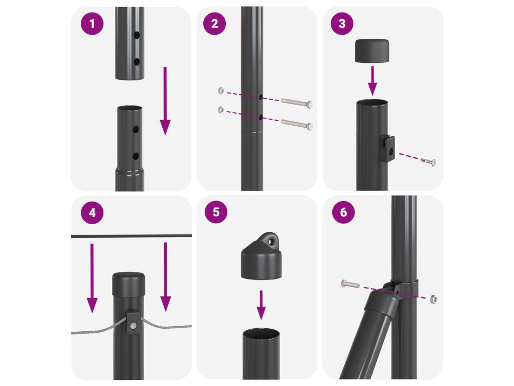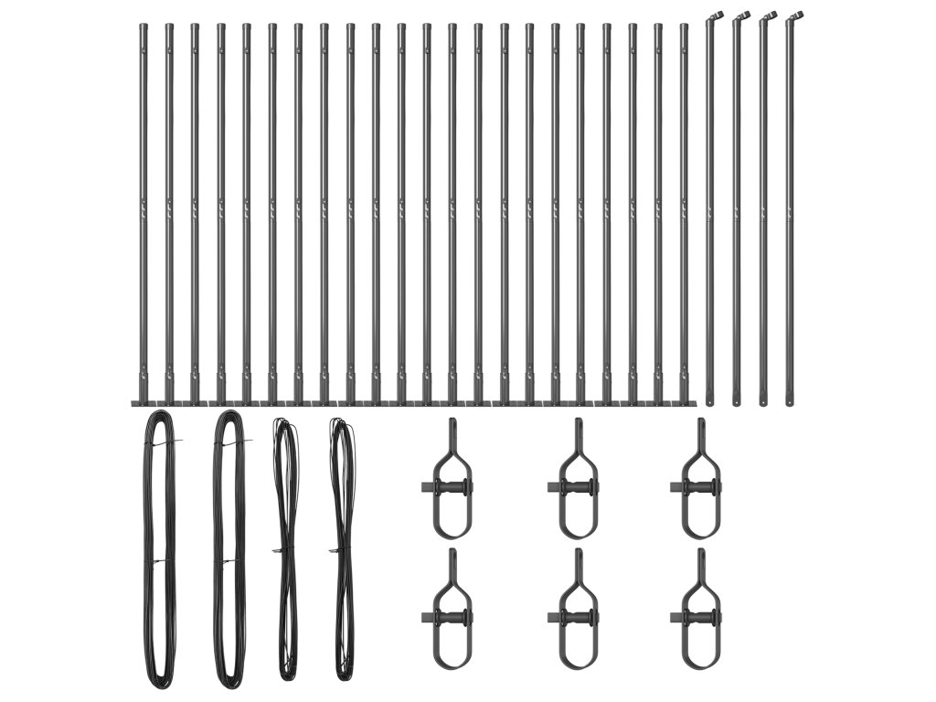 - Doručení obsahuje: 22 x sloupek, 4 x úhlový sloupek, 22 x základová deska, 22 x plastová krytka, 66 x plastová podpěra pro napínací drát, 4 x kryt úhlového sloupku, 4 x hardware úhlového sloupku, 6 x napínač, 2 x 25 m vázací drát, 2 x 80 m napínací drát
