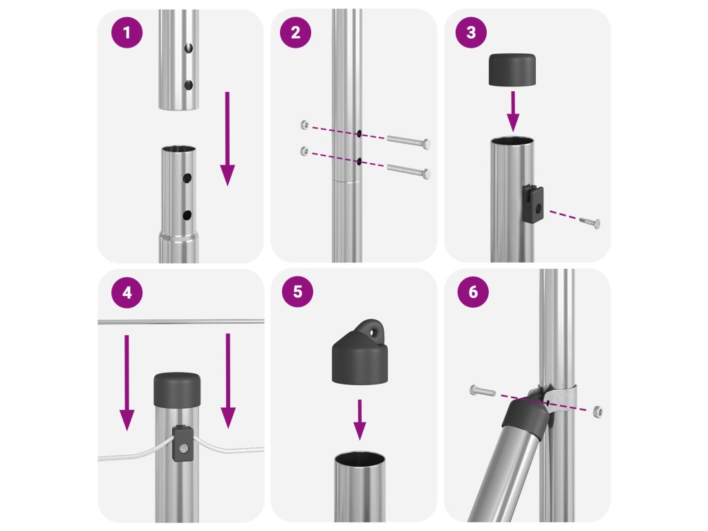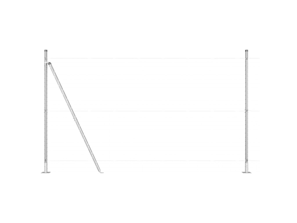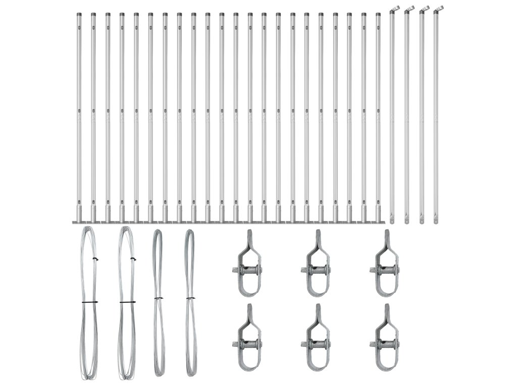 - Doručení obsahuje: 22 x sloupek, 4 x úhlový sloupek, 22 x základní deska, 22 x plastová krytka, 66 x plastová napínací podpěra, 4 x kryt úhlového sloupku, 4 x hardware pro úhlový sloupek, 6 x napínač, 2 x 25 m svazovací drát, 2 x 80 m napínací drát