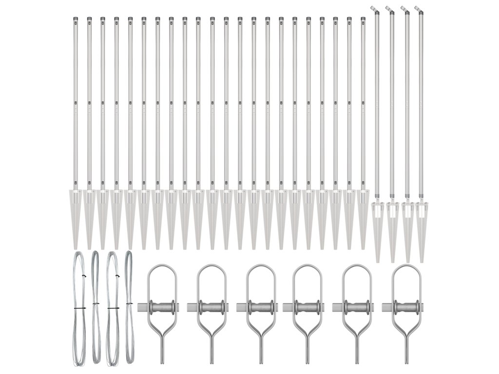 - Delivery Contains: 22 x Post, 4 x Angle Post, 22 x Spike, 4 x Angle Spike, 22 x Plastic Cap, 66 x Plastic Tension Wire Supporter, 66 x Crew on the Plastic Supporter, 4 x Angle Post Cap, 4 x Angle Post Hardware, 4 x Angle Post Hardware Screw M6X25, 52 x Male Part Screw M6X40, 6 x Tensioner, 2 x 25m Binding Wire, 2 x 80m Tension Wire