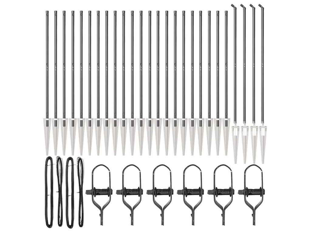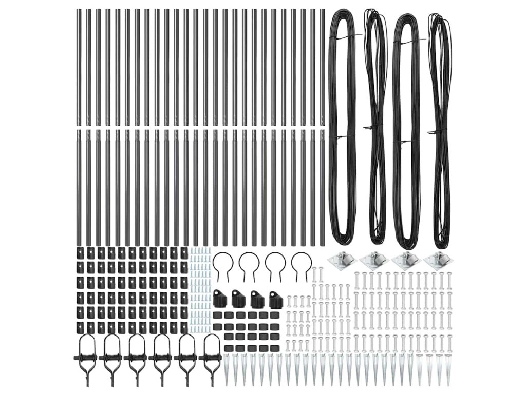 - Obsah dodávky: 22 x sloupek, 4 x úhlový sloupek, 22 x spike, 4 x úhlový spike, 22 x plastová krytka, 66 x plastová napínací drátová podpora, 66 x šroub na plastovém podpoře, 4 x úhlová krytka sloupku, 4 x úhlový hardware sloupku, 4 x úhlový šroub hardware M6X25, 52 x šroub M6X40, 6 x napínák, 2 x 25m vázací drát, 2 x 80m napínací drát