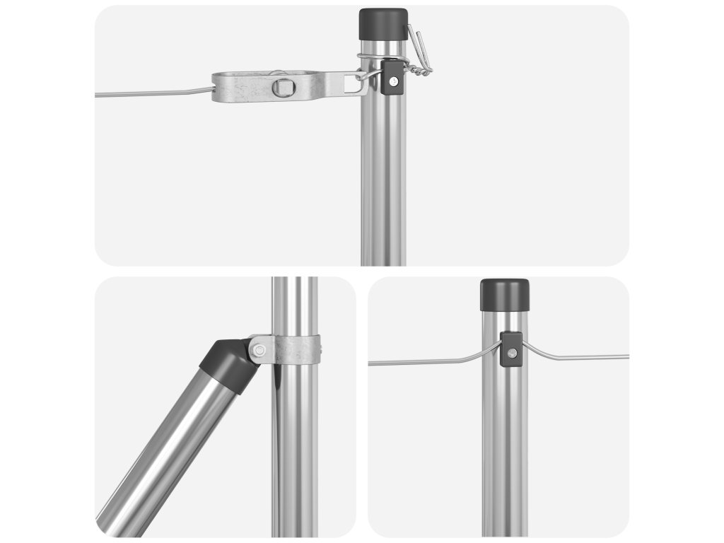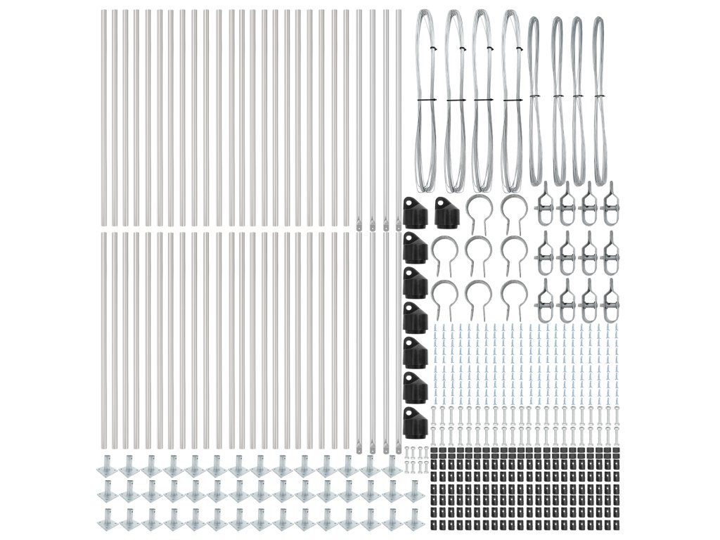- Dodávka obsahuje: 44 x sloupek, 8 x úhlový sloupek, 44 x základní deska, 44 x plastová krytka, 132 x podporovač napínacího drátu, 8 x úhlová krytka, 8 x úhlové příslušenství, 12 x napínač, 4 x 25 m vazací drát, 4 x 80 m napínací drát