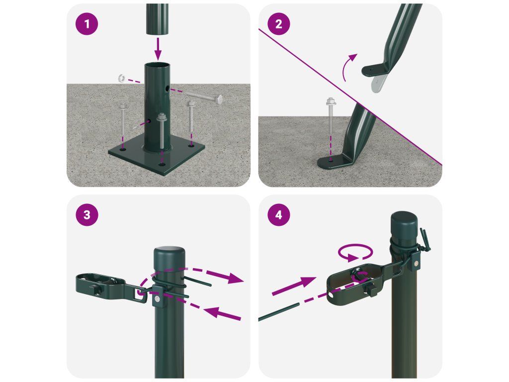- Delivery Contains: 44 x Post, 8 x Angle post, 44 x Base plate, 44 x Plastic cap, 132 x Plastic tension wire supporter, 8 x Angle post cap, 8 x Angle post hardware, 12 x Tensioner, 4 x 25 m Binding wire, 4 x 80 m Tension wire