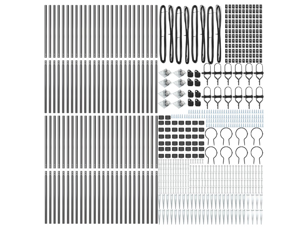 - Delivery Contains: 44 x Post, 8 x Angle Post, 44 x Spike, 8 x Angle Spike, 44 x Plastic Cap, 132 x Plastic Tension Wire Supporter, 132 x Crew on the Plastic Supporter, 8 x Angle Post Cap, 8 x Angle Post Hardware, 8 x Angle Post Hardware Screw M6X25, 104 x Male Part Screw M6X40, 12 x Tensioner, 4 x 25m Binding Wire, 4 x 80m Tension Wire