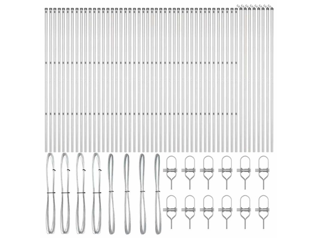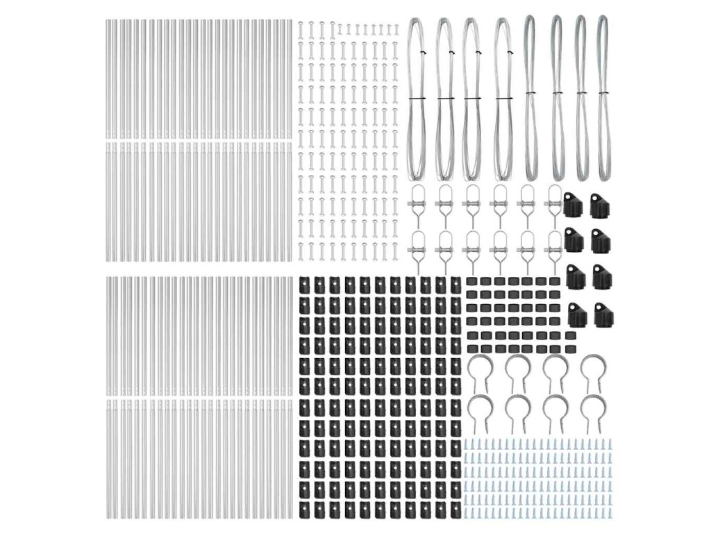 - Co dodávka obsahuje: 44 x sloupek, 8 x úhlový sloupek, 44 x plastová krytka, 132 x plastová podpora napínacího drátu, 132 x šroub na plastovém podporce, 8 x kryt úhlového sloupku, 8 x hardware úhlového sloupku, 8 x šroub úhlového sloupku M6X25, 104 x šroub mužské části M6X40, 12 x napínací zařízení, 4 x 25m vázací drát, 4 x 80m napínací drát