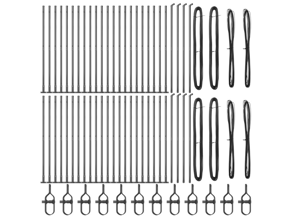 - Dodávka obsahuje: 44 x sloupek, 8 x úhlový sloupek, 44 x základová deska, 44 x plastová krytka, 132 x plastový podporovač napínacího drátu, 8 x kryt úhlového sloupku, 8 x hardware úhlového sloupku, 12 x napínač, 4 x 25 m vazební drát, 4 x 80 m napínací drát