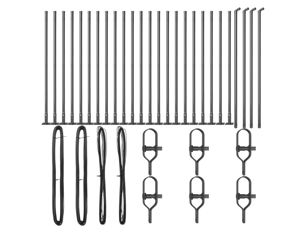 - Dodávka obsahuje: 22 x sloup, 4 x úhlový sloup, 22 x základní deska, 22 x plastová krytka, 66 x podpěra pro plastový napínací drát, 4 x kryt úhlového sloupu, 4 x hardware úhlového sloupu, 6 x napínač, 2 x 25 m vázací drát, 2 x 80 m napínací drát