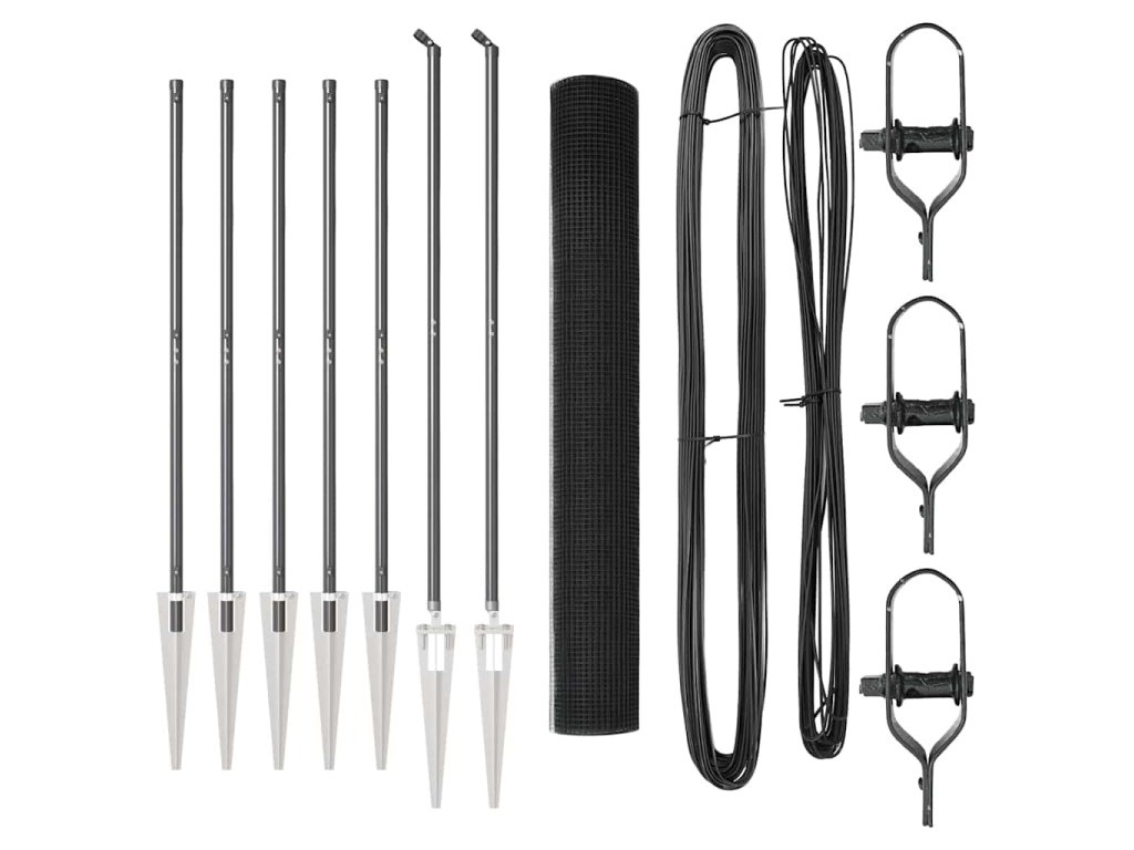 - 1 x Oplocení, 5 x Sloupek, 2 x Úhlový sloupek, 5 x Hrot, 2 x Úhlový hrot, 5 x Plastová krytka, 15 x Plastový podpěra napínacího drátu, 2 x Krytka úhlového slouku, 2 x Hardware úhlového sloupku, 3 x Napínač, 1 x 25 m Vázací drát, 1 x 33 m Napínací drát