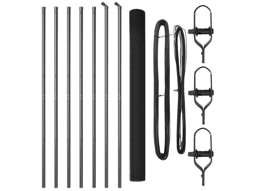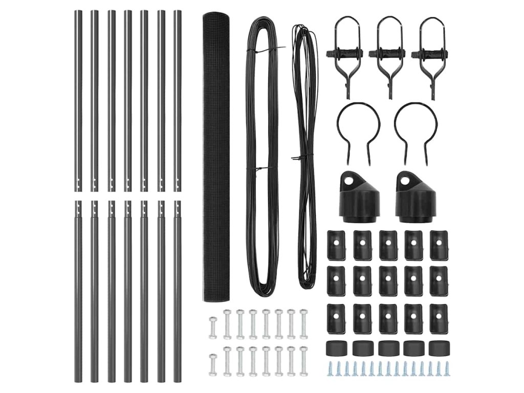 - 1 x Oplocení, 5 x Sloupek, 2 x Úhlový sloupek, 5 x Plastová krytka, 15 x Plastový podpěra napínacího drátu, 2 x Krytka úhlového sloupku, 2 x Hardware úhlového sloupku, 3 x Napínač, 1 x 25 m Vázací drát, 1 x 33 m Napínací drát