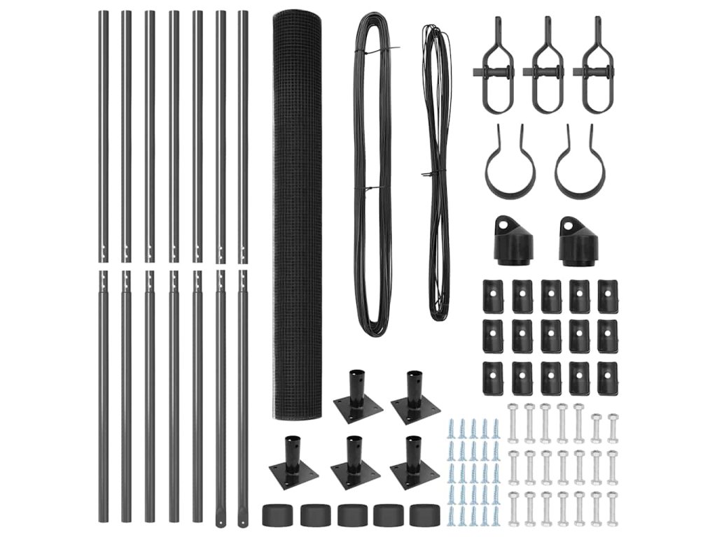 - 1 x Oplocení, 5 x Sloupek, 2 x Úhlový sloupek, 5 x Základová deska, 5 x Plastová krytka, 15 x Plastový podpěra napínacího drátu, 2 x Krytka úhlového sloupku, 2 x Hardware úhlového sloupku, 3 x Napínač, 1 x 25 m Vázací drát, 1 x 33 m Napínací drát