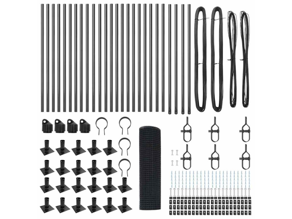 - 1 x Oplocení, 44 x Sloupek, 8 x Úhlový sloupek, 44 x Základová deska, 44 x Plastová krytka, 132 x Plastový podpěra napínacího drátu, 8 x Krytka úhlového sloupku, 8 x Hardware úhlového sloupku, 12 x Napínač, 4 x 25 m Vázací drát, 4 x 80 m Napínací drát