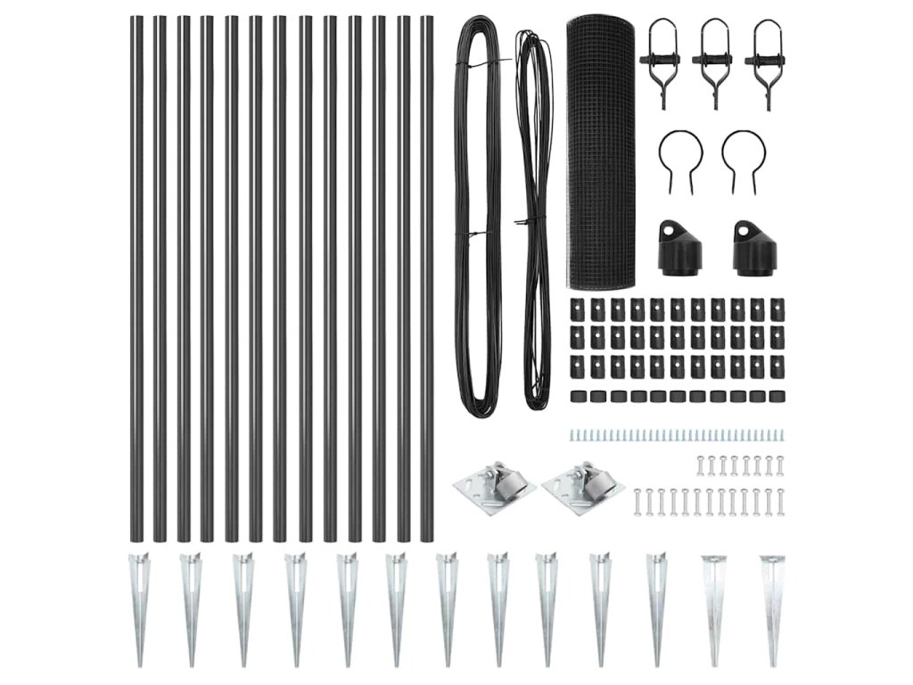 - 1 x Oplocení, 11 x Sloupek, 2 x Úhlový sloupek, 11 x Hrot, 2 x Úhlový hrot, 11 x Plastová krytka, 33 x Plastový podpěra napínacího drátu, 2 x Krytka úhlového slouku, 2 x Hardware úhlového sloupku, 3 x Napínač, 1 x 25 m Vázací drát, 1 x 80 m Napínací drát