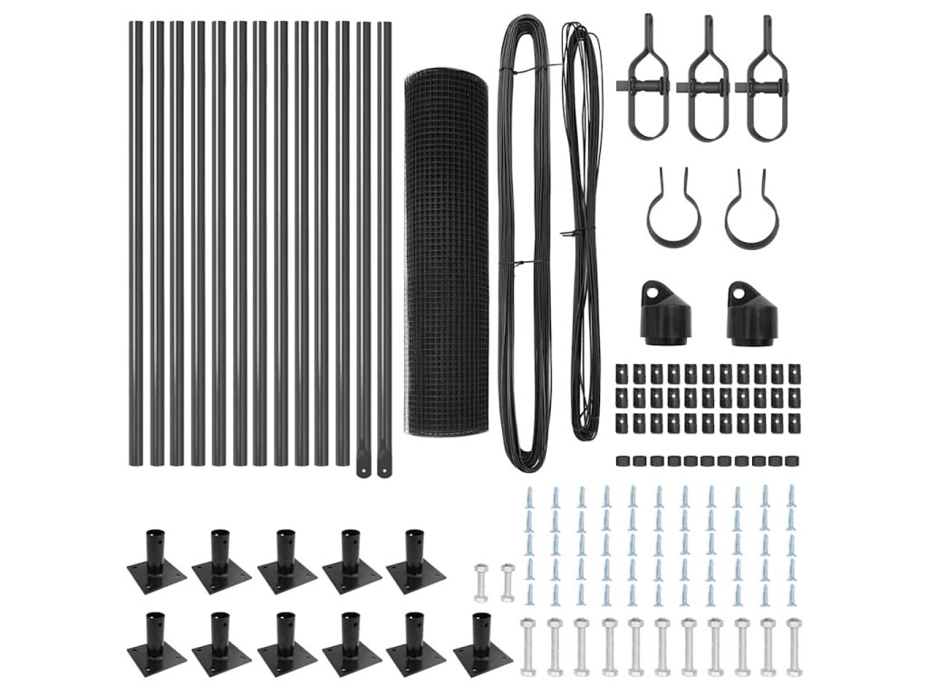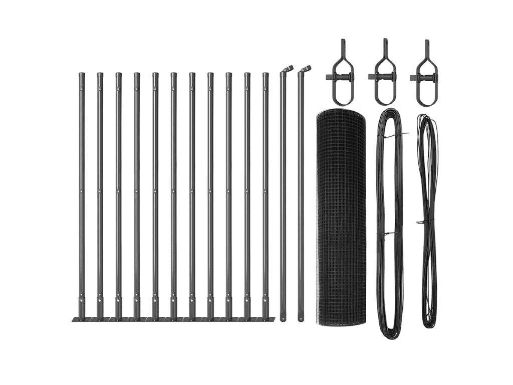 - 1 x Oplocení, 11 x Sloupek, 2 x Úhlový sloupek, 11 x Základová deska, 11 x Plastová krytka, 33 x Plastový podpěra napínacího drátu, 2 x Krytka úhlového slouku, 2 x Hardware úhlového sloupku, 3 x Napínač, 1 x 25 m Vázací drát, 1 x 80 m Napínací drát