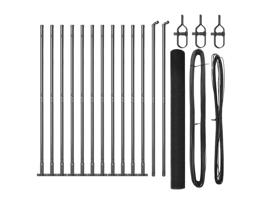 - 1 x Oplocení, 11 x Sloupek, 2 x Úhlový sloupek, 11 x Základová deska, 11 x Plastová krytka, 33 x Plastový podpěra napínacího drátu, 2 x Krytka úhlového slouku, 2 x Hardware úhlového sloupku, 3 x Napínač, 1 x 25 m Vázací drát, 1 x 80 m Napínací drát