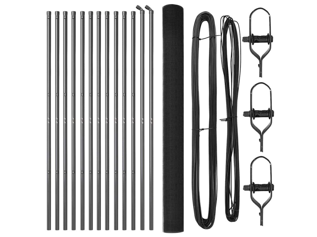 - 1 x Oplocení, 11 x Sloupek, 2 x Úhlový sloupek, 11 x Plastová krytka, 33 x Plastový podpěra napínacího drátu, 2 x Krytka úhlového sloupku, 2 x Hardware úhlového sloupku, 3 x Napínač, 1 x 25 m Vázací drát, 1 x 80 m Napínací drát
