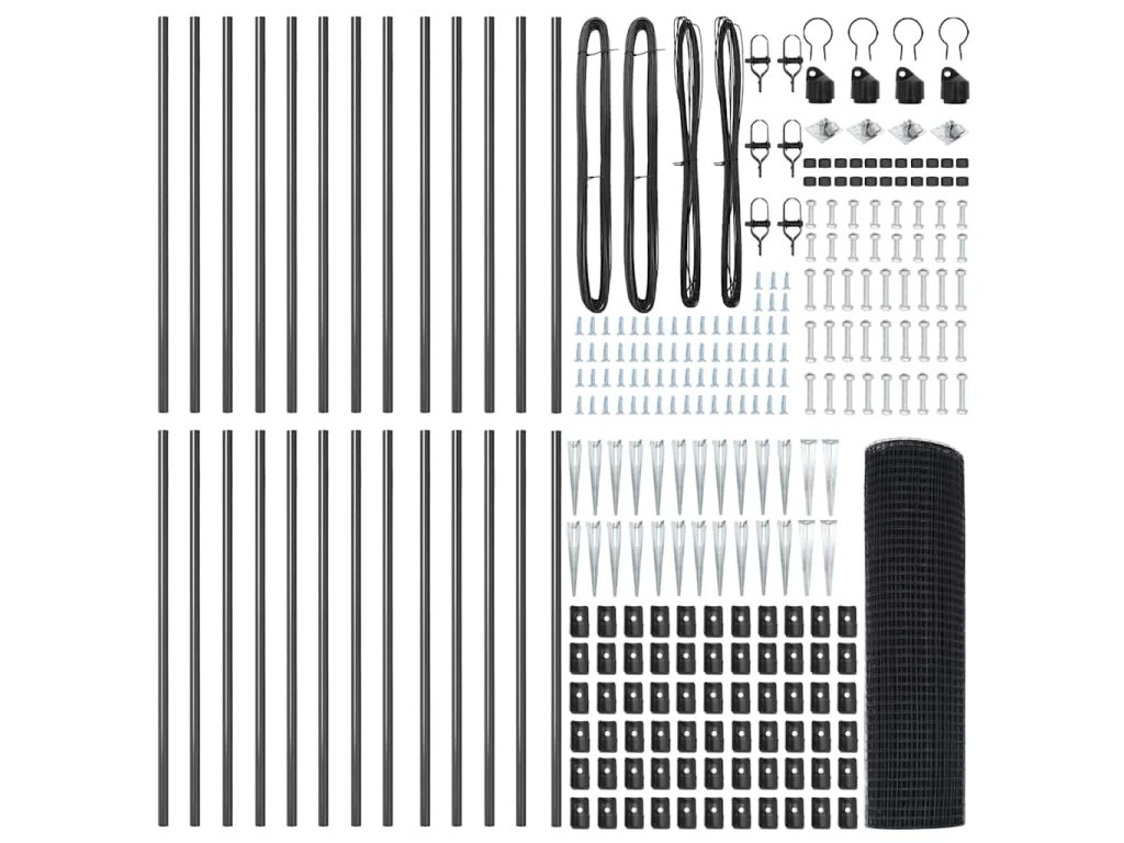 - 1 x Oplocení, 11 x Sloupek, 2 x Úhlový sloupek, 11 x Hrot, 2 x Úhlový hrot, 11 x Plastová krytka, 33 x Plastový podpěra napínacího drátu, 2 x Krytka úhlového slouku, 2 x Hardware úhlového sloupku, 3 x Napínač, 1 x 25 m Vázací drát, 1 x 80 m Napínací drát
