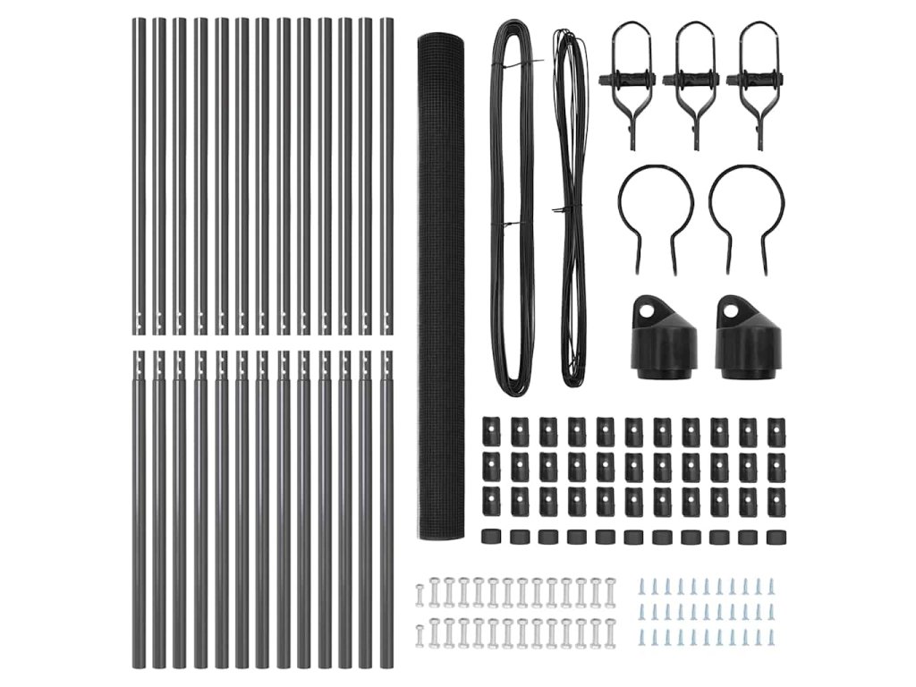 - 1 x Oplocení, 22 x Sloupek, 4 x Úhlový sloupek, 22 x Plastová krytka, 66 x Plastový podpěra napínacího drátu, 4 x Krytka úhlového sloupku, 4 x Hardware úhlového sloupku, 6 x Napínač, 2 x 25 m Vázací drát, 2 x 80 m Napínací drát