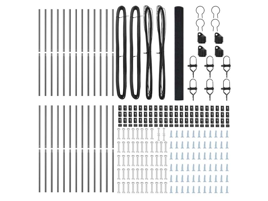 - 1 x Oplocení, 22 x Sloupek, 4 x Úhlový sloupek, 22 x Plastová krytka, 66 x Plastový podpěra napínacího drátu, 4 x Krytka úhlového sloupku, 4 x Hardware úhlového sloupku, 6 x Napínač, 2 x 25 m Vázací drát, 2 x 80 m Napínací drát
