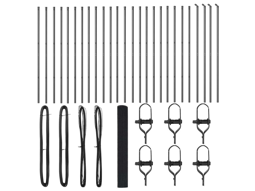 - 1 x Oplocení, 22 x Sloupek, 4 x Úhlový sloupek, 22 x Plastová krytka, 66 x Plastový podpěra napínacího drátu, 4 x Krytka úhlového sloupku, 4 x Hardware úhlového sloupku, 6 x Napínač, 2 x 25 m Vázací drát, 2 x 80 m Napínací drát