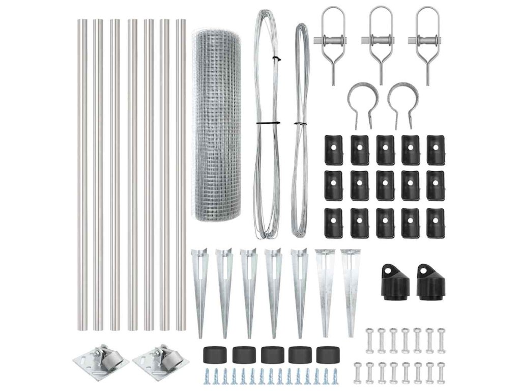 - 1 x Oplocení, 5 x Sloupek, 2 x Úhlový sloupek, 5 x Hrot, 2 x Úhlový hrot, 5 x Plastová krytka, 15 x Plastový podpěra napínacího drátu, 2 x Krytka úhlového slouku, 2 x Hardware úhlového sloupku, 3 x Napínač, 1 x 25 m Vázací drát, 1 x 33 m Napínací drát
