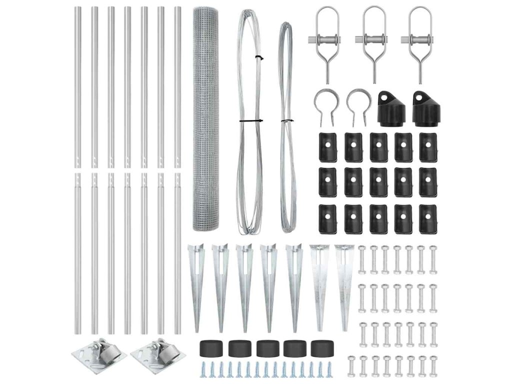 - 1 x Oplocení, 5 x Sloupek, 2 x Úhlový sloupek, 5 x Hrot, 2 x Úhlový hrot, 5 x Plastová krytka, 15 x Plastový podpěra napínacího drátu, 2 x Krytka úhlového slouku, 2 x Hardware úhlového sloupku, 3 x Napínač, 1 x 25 m Vázací drát, 1 x 33 m Napínací drát