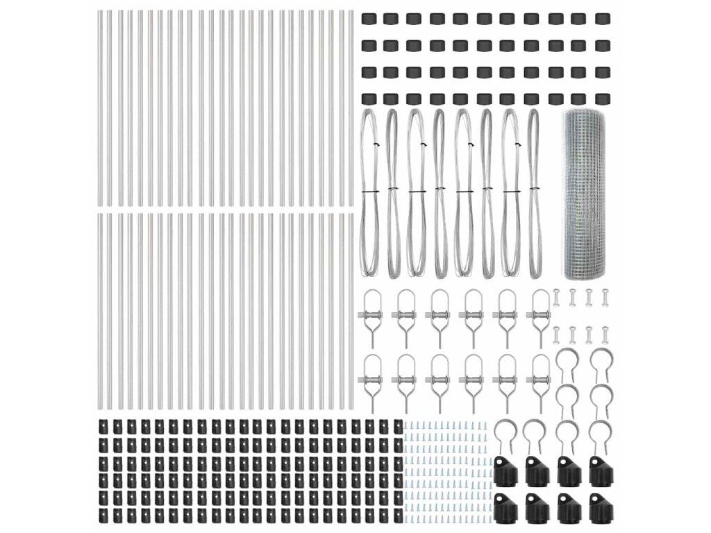 - 1 x Oplocení, 44 x Sloupek, 8 x Úhlový sloupek, 44 x Plastová krytka, 132 x Plastový podpěra napínacího drátu, 8 x Krytka úhlového sloupku, 8 x Hardware úhlového sloupku, 12 x Napínač, 4 x 25 m Vázací drát, 4 x 80 m Napínací drát