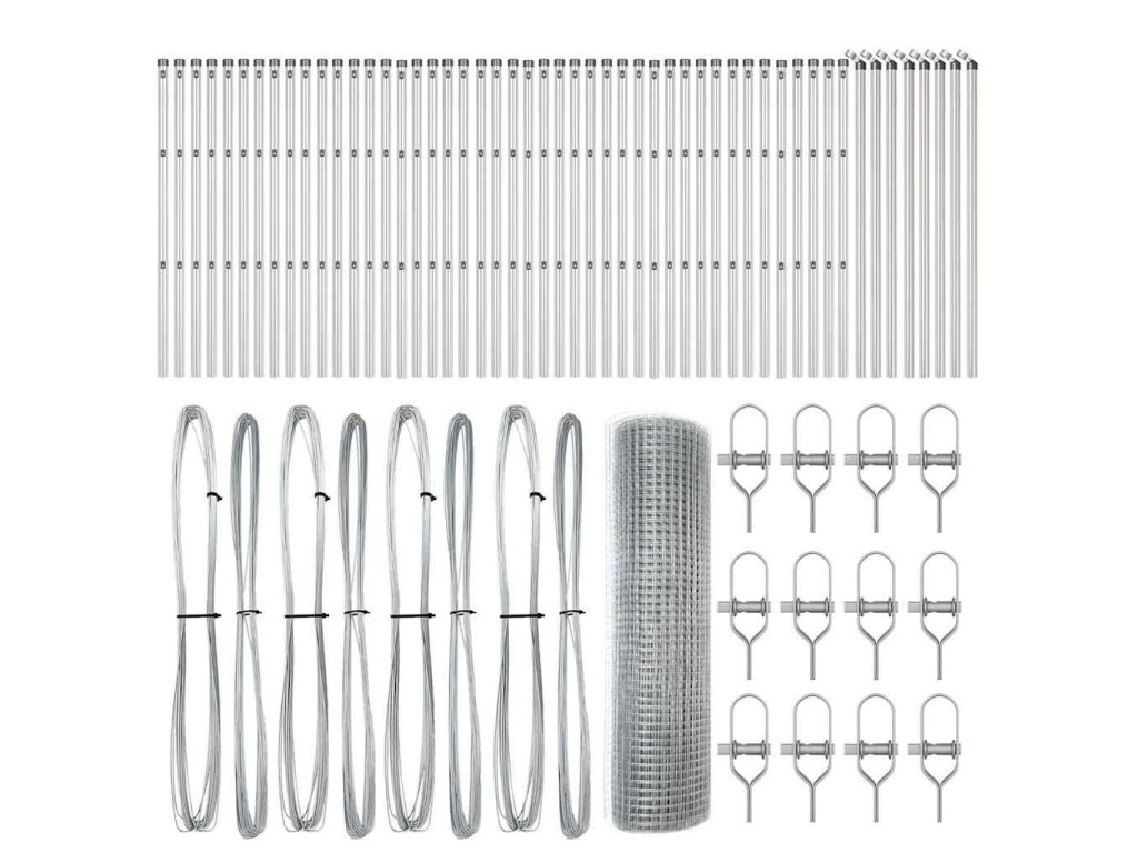 - 1 x Oplocení, 44 x Sloupek, 8 x Úhlový sloupek, 44 x Plastová krytka, 132 x Plastový podpěra napínacího drátu, 8 x Krytka úhlového sloupku, 8 x Hardware úhlového sloupku, 12 x Napínač, 4 x 25 m Vázací drát, 4 x 80 m Napínací drát