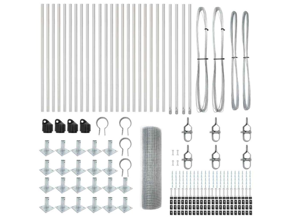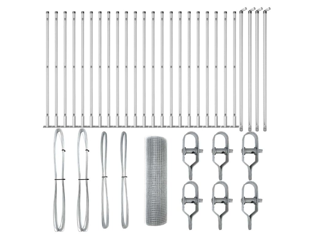 - 1 x Oplocení, 44 x Sloupek, 8 x Úhlový sloupek, 44 x Základová deska, 44 x Plastová krytka, 132 x Plastový podpěra napínacího drátu, 8 x Krytka úhlového sloupku, 8 x Hardware úhlového sloupku, 12 x Napínač, 4 x 25 m Vázací drát, 4 x 80 m Napínací drát