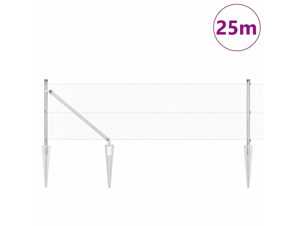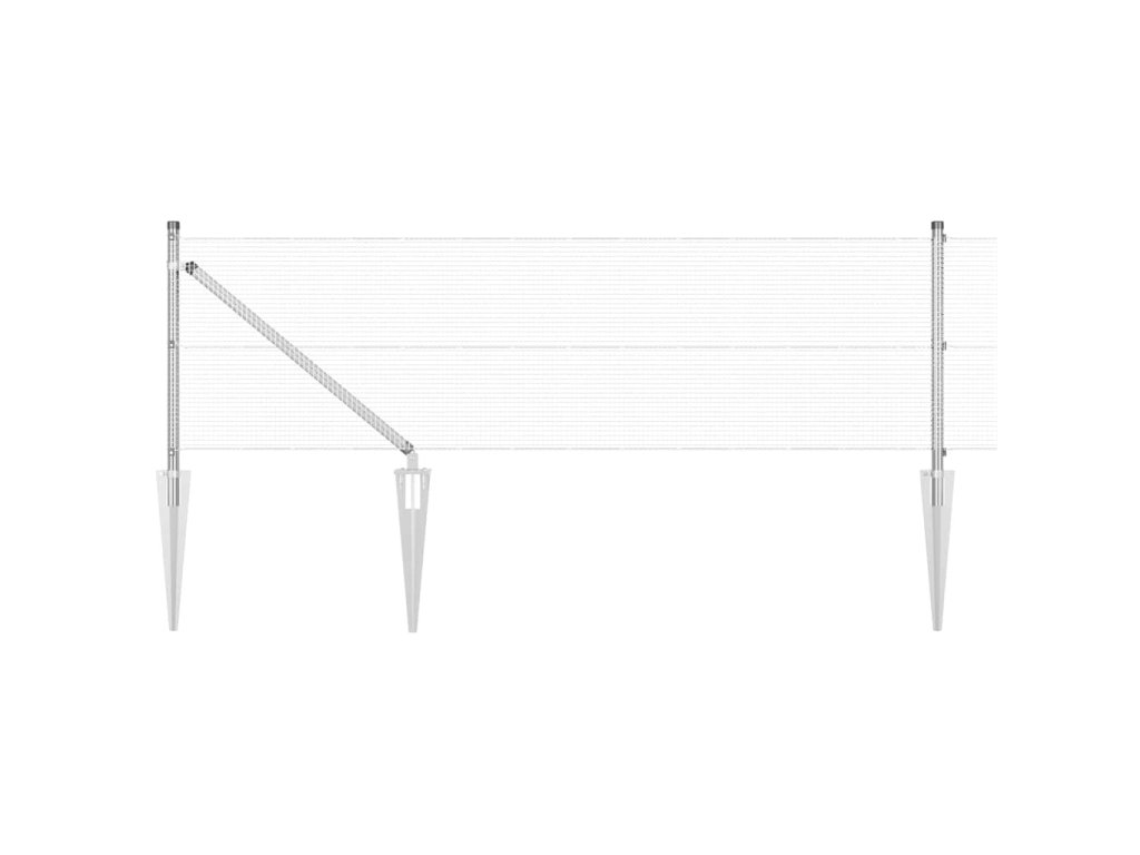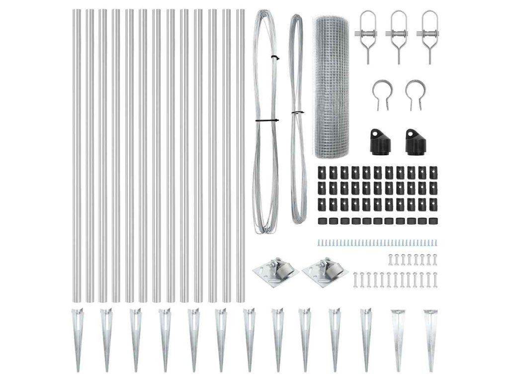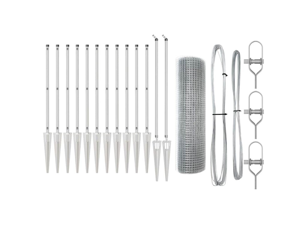 - 1 x Oplocení, 11 x Sloupek, 2 x Úhlový sloupek, 11 x Hrot, 2 x Úhlový hrot, 11 x Plastová krytka, 33 x Plastový podpěra napínacího drátu, 2 x Krytka úhlového slouku, 2 x Hardware úhlového sloupku, 3 x Napínač, 1 x 25 m Vázací drát, 1 x 80 m Napínací drát