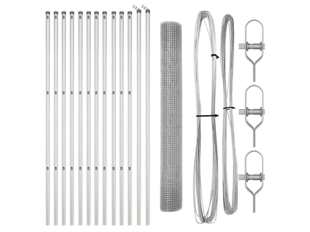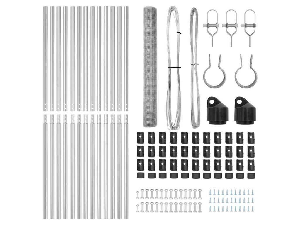 - 1 x Oplocení, 11 x Sloupek, 2 x Úhlový sloupek, 11 x Plastová krytka, 33 x Plastový podpěra napínacího drátu, 2 x Krytka úhlového sloupku, 2 x Hardware úhlového sloupku, 3 x Napínač, 1 x 25 m Vázací drát, 1 x 80 m Napínací drát