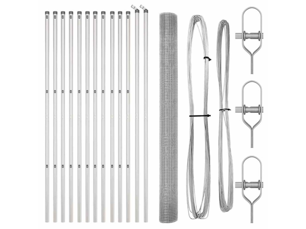 - 1 x Oplocení, 11 x Sloupek, 2 x Úhlový sloupek, 11 x Plastová krytka, 33 x Plastový podpěra napínacího drátu, 2 x Krytka úhlového sloupku, 2 x Hardware úhlového sloupku, 3 x Napínač, 1 x 25 m Vázací drát, 1 x 80 m Napínací drát
