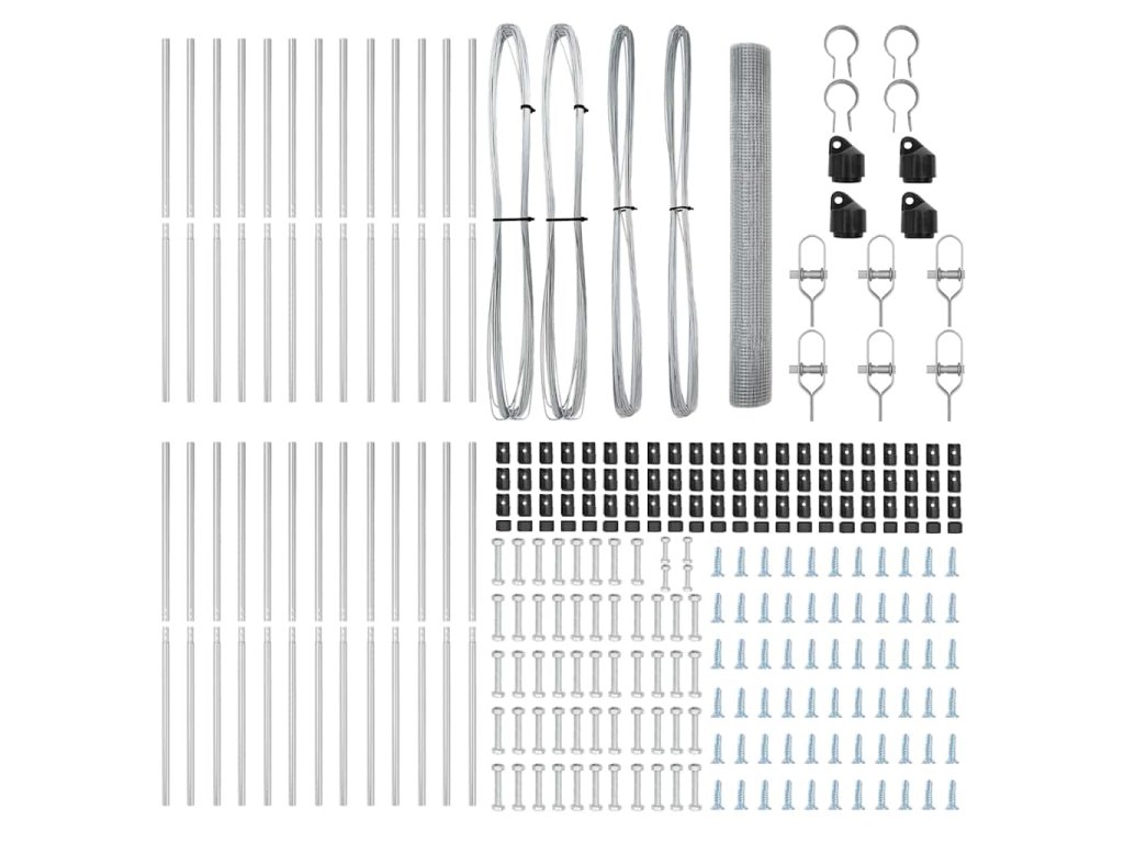 - 1 x Oplocení, 22 x Sloupek, 4 x Úhlový sloupek, 22 x Plastová krytka, 66 x Plastový podpěra napínacího drátu, 4 x Krytka úhlového sloupku, 4 x Hardware úhlového sloupku, 6 x Napínač, 2 x 25 m Vázací drát, 2 x 80 m Napínací drát