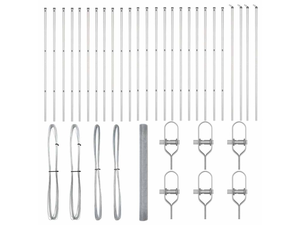 - 1 x Oplocení, 11 x Sloupek, 2 x Úhlový sloupek, 11 x Plastová krytka, 33 x Plastový podpěra napínacího drátu, 2 x Krytka úhlového sloupku, 2 x Hardware úhlového sloupku, 3 x Napínač, 1 x 25 m Vázací drát, 1 x 80 m Napínací drát