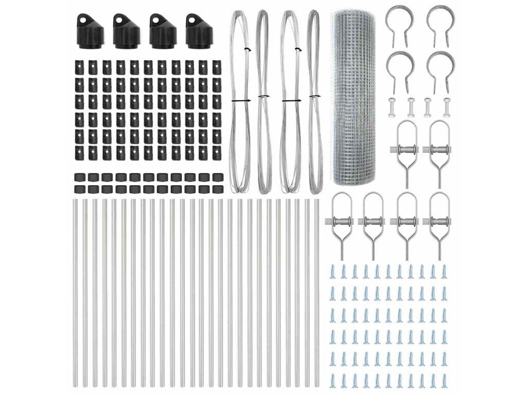 - 1 x Oplocení, 22 x Sloupek, 4 x Úhlový sloupek, 22 x Plastová krytka, 66 x Plastový podpěra napínacího drátu, 4 x Krytka úhlového sloupku, 4 x Hardware úhlového sloupku, 6 x Napínač, 2 x 25 m Vázací drát, 2 x 80 m Napínací drát