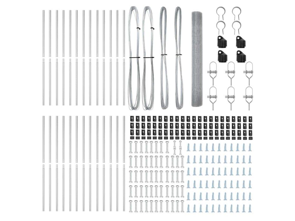 - 1 x Oplocení, 22 x Sloupek, 4 x Úhlový sloupek, 22 x Plastová krytka, 66 x Plastový podpěra napínacího drátu, 4 x Krytka úhlového sloupku, 4 x Hardware úhlového sloupku, 6 x Napínač, 2 x 25 m Vázací drát, 2 x 80 m Napínací drát