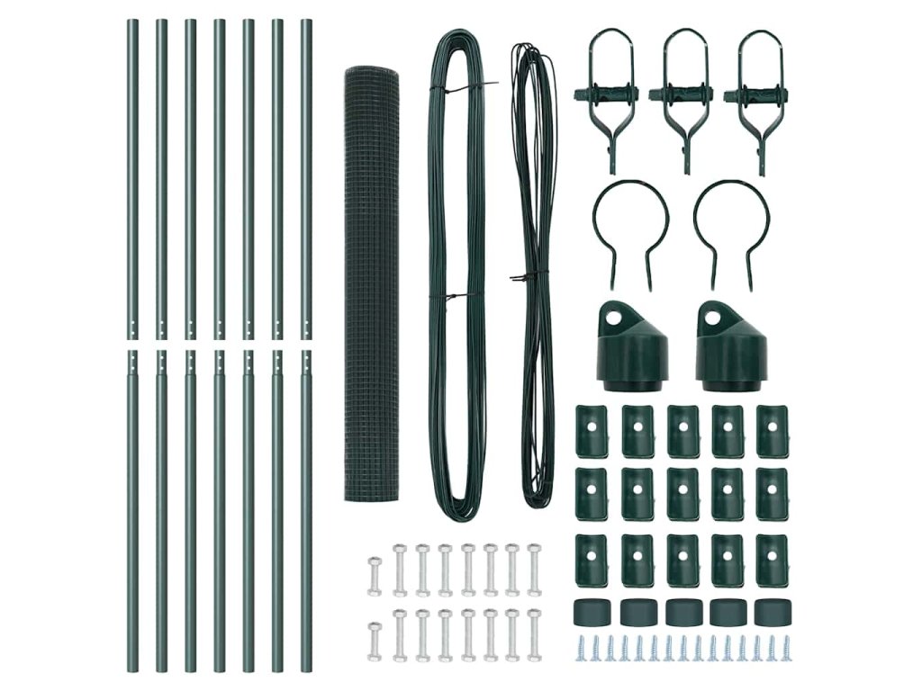 - 1 x Oplocení, 5 x Sloupek, 2 x Úhlový sloupek, 5 x Plastová krytka, 15 x Plastový podpěra napínacího drátu, 2 x Krytka úhlového sloupku, 2 x Hardware úhlového sloupku, 3 x Napínač, 1 x 25 m Vázací drát, 1 x 33 m Napínací drát