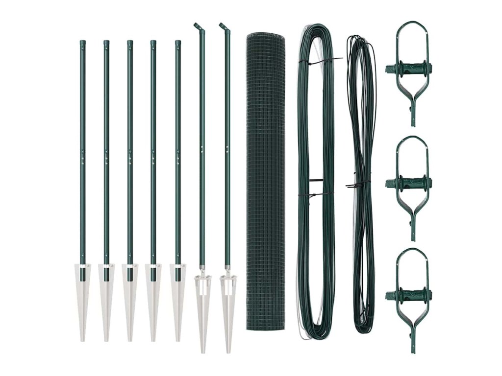 - 1 x Oplocení, 5 x Sloupek, 2 x Úhlový sloupek, 5 x Hrot, 2 x Úhlový hrot, 5 x Plastová krytka, 15 x Plastový podpěra napínacího drátu, 2 x Krytka úhlového slouku, 2 x Hardware úhlového sloupku, 3 x Napínač, 1 x 25 m Vázací drát, 1 x 33 m Napínací drát