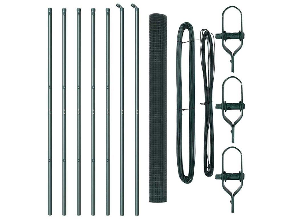 - 1 x Oplocení, 5 x Sloupek, 2 x Úhlový sloupek, 5 x Plastová krytka, 15 x Plastový podpěra napínacího drátu, 2 x Krytka úhlového sloupku, 2 x Hardware úhlového sloupku, 3 x Napínač, 1 x 25 m Vázací drát, 1 x 33 m Napínací drát