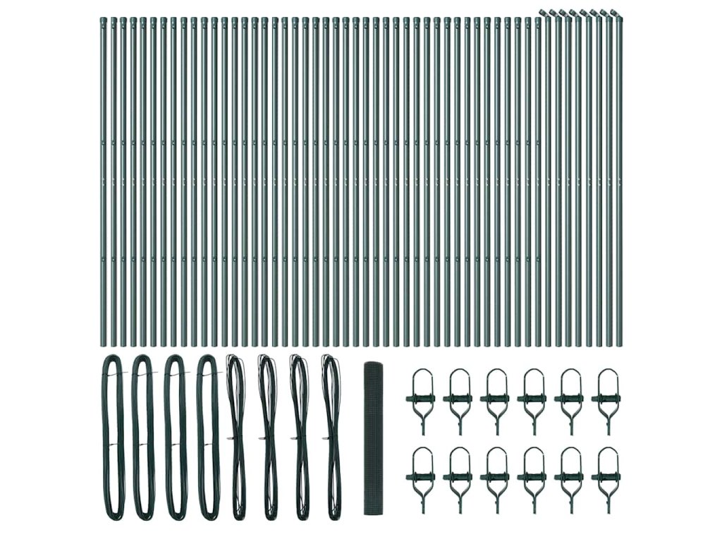 - 1 x Oplocení, 44 x Sloupek, 8 x Úhlový sloupek, 44 x Plastová krytka, 132 x Plastový podpěra napínacího drátu, 8 x Krytka úhlového sloupku, 8 x Hardware úhlového sloupku, 12 x Napínač, 4 x 25 m Vázací drát, 4 x 80 m Napínací drát