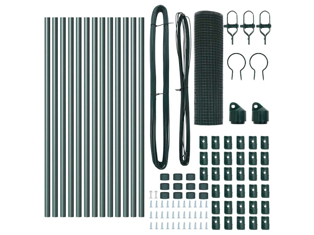- 1 x Oplocení, 11 x Sloupek, 2 x Úhlový sloupek, 11 x Plastová krytka, 33 x Plastový podpěra napínacího drátu, 2 x Krytka úhlového sloupku, 2 x Hardware úhlového sloupku, 3 x Napínač, 1 x 25 m Vázací drát, 1 x 80 m Napínací drát